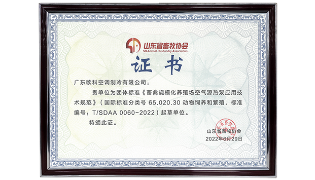 EK空調參與起草《畜禽規模化養殖場空氣源熱泵應用技術規範》2022-09-01近日,經山東省畜牧協會批準,團體標準《畜禽規模化養殖場空氣源熱泵應用技術規範》正式發布並實施。廣東歐科空調製冷有限公司(簡稱:EK空調)作為起草單位,參與了該標準的製定。