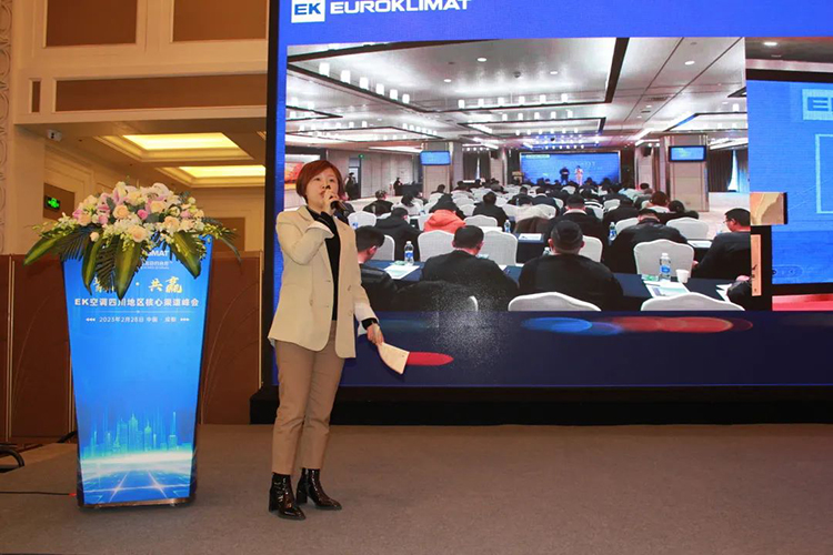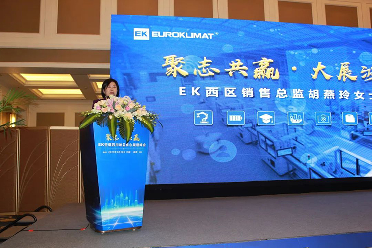 會議開始,EK空調華西區區總胡燕玲首先致辭,她向在場嘉賓介紹了疫情三年來EK空調在四川以及整個華西地區的業績增長情況,並感謝各位經銷商長期以來的支持。希望在2023年,大家可以把握市場機遇,一起再創佳績。胡燕玲強調:商家賺到錢,我們才有市場。