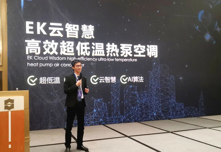 本次會議以“低碳設計,智慧運行”為主題,圍繞建築環境營造低碳技術、近零能耗建築、清潔供熱技術與設備、智慧能源等國內外熱點方向開展研討交流。EK空調產品經理陳旭金以《EK雲智慧高效超低溫熱泵空調》為主題發表演講,和現場嘉賓介紹了普通風冷熱泵和超低溫空氣源熱泵的區別、EK超低溫熱泵的發展曆史、產品陣容、係統優勢以及在嚴寒地區各行業的應用案例。