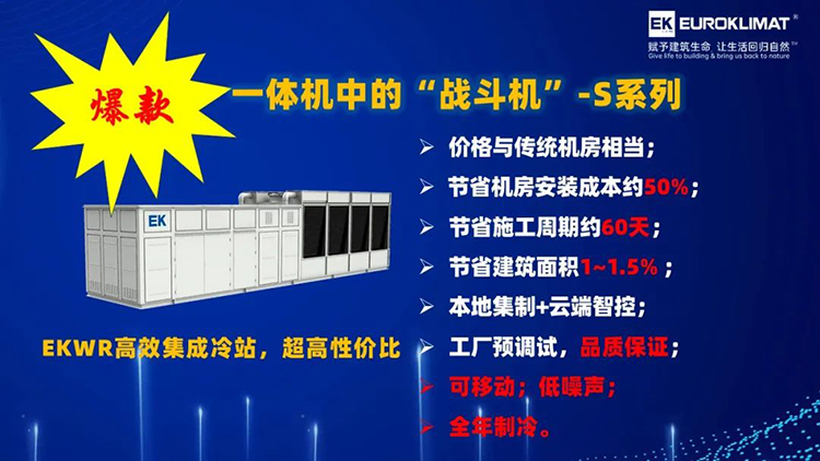 而號稱一體機中的“戰鬥機”——S係列雲智慧高效集成冷站,該係列集成冷站最大的優勢就是采用EK自製冷卻塔,超高性價比,價格與傳統機房的造價相當,安裝成本節省約50%,且冷卻塔與主機段采用一體化設計,是真正意義上的一體機。