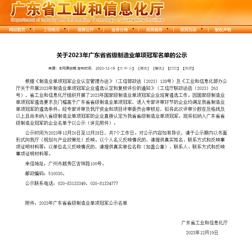 廣guang東dong省sheng省sheng級ji製zhi造zao業ye單dan項xiang冠guan軍jun企qi業ye評ping選xuan由you廣guang東dong省sheng工gong業ye和he信xin息xi化hua廳ting主zhu辦ban,旨zhi在zai推tui動dong廣guang東dong省sheng製zhi造zao業ye高gao質zhi量liang發fa展zhan,推tui動dong廣guang東dong省sheng邁mai向xiang全quan球qiu產chan業ye鏈lian價jia值zhi鏈lian中zhong高gao端duan。根gen據ju工gong信xin部bu定ding義yi,製zhi造zao業ye單dan項xiang冠guan軍jun是shi指zhi長chang期qi專zhuan注zhu於yu製zhi造zao業ye某mou些xie特te定ding細xi分fen產chan品pin市shi場chang,生sheng產chan技ji術shu或huo工gong藝yi國guo際ji領ling先xian,單dan項xiang產chan品pin市shi場chang占zhan有you率lv位wei居ju全quan球qiu前qian列lie的de企qi業ye和he產chan品pin。
