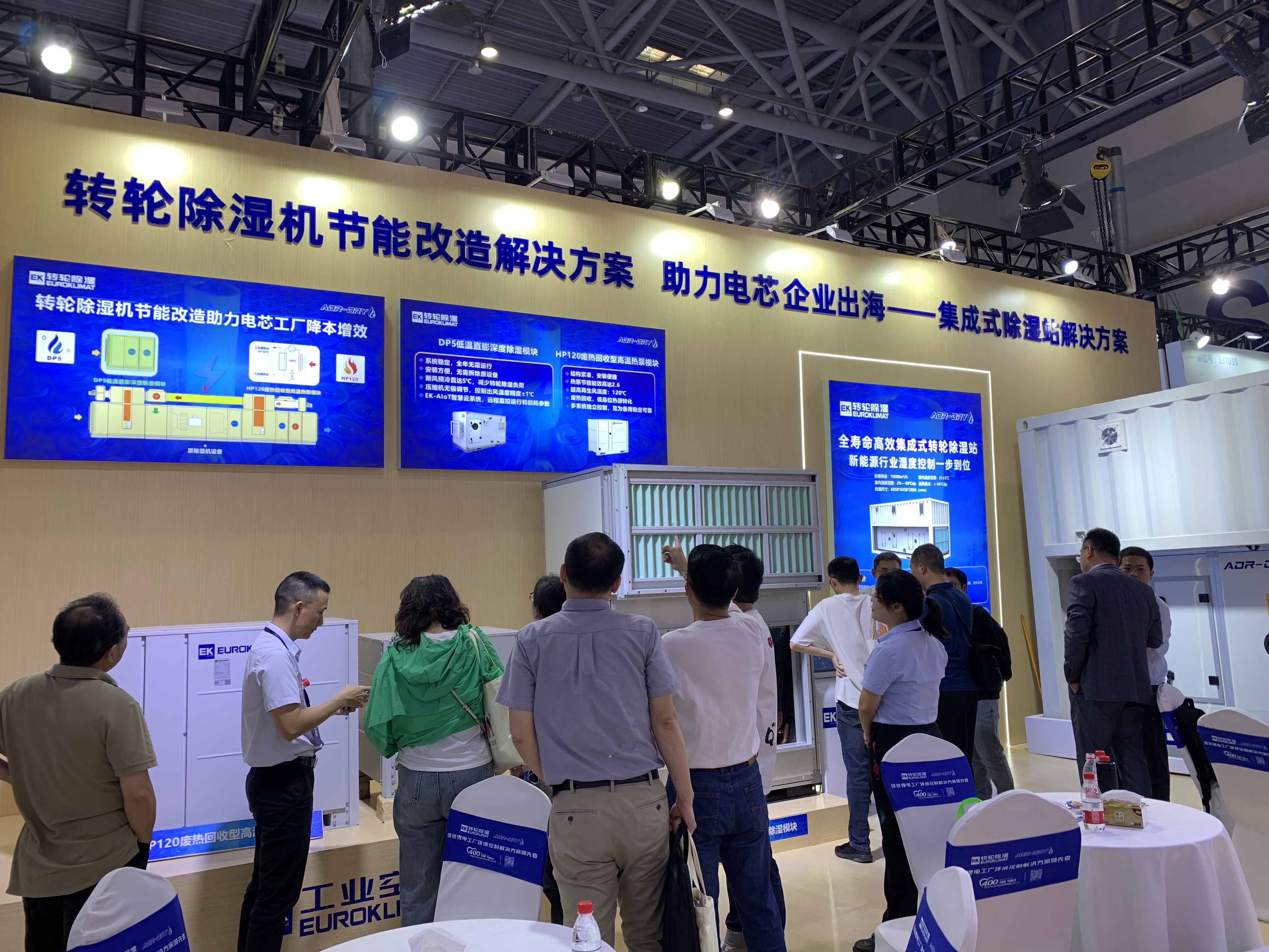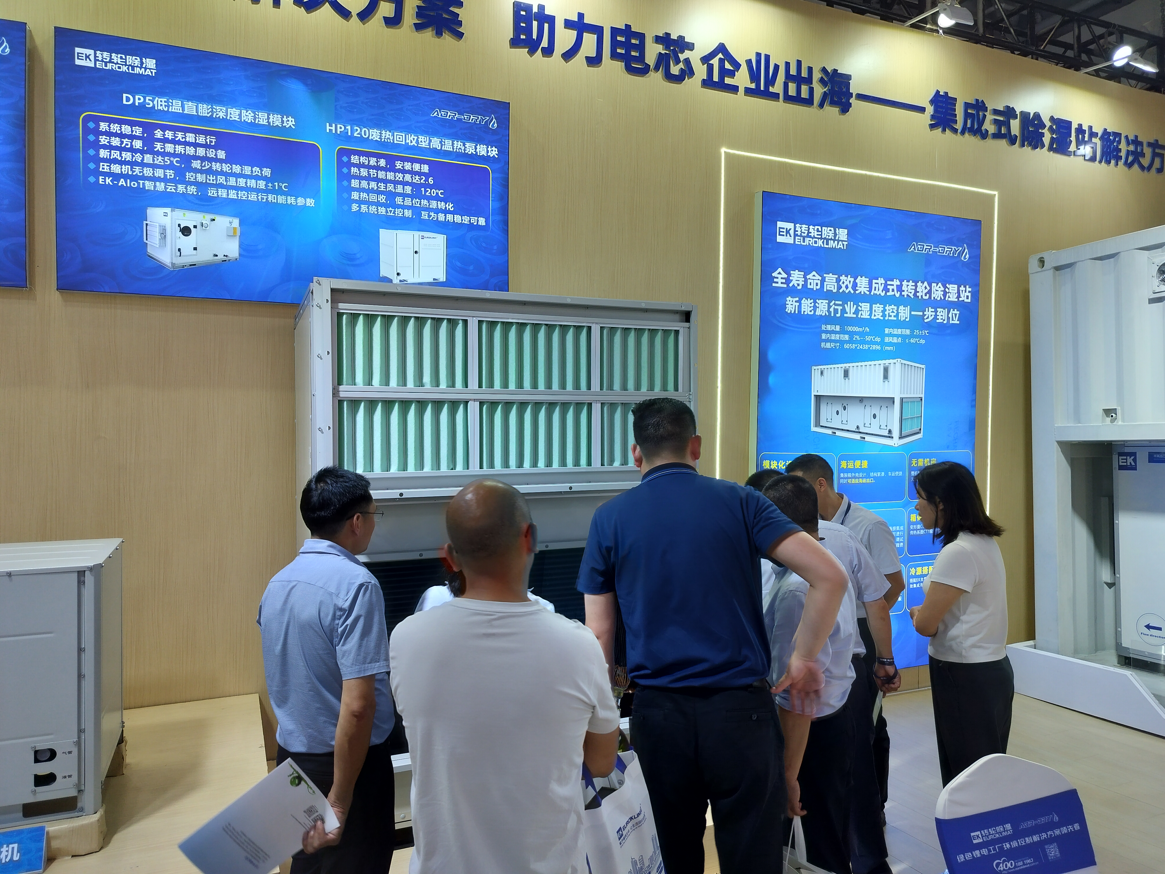 基於此,EK工業空調在CIBF2024展會上重點展示了一體化高效轉輪除濕機、分布式雲智慧高效集成冷站、工業高溫熱泵等一係列節能方案,為電芯企業提供了全方位的節能解決方案;同時特別推介了基於DP5低溫直膨深度除濕模塊和HP120廢熱回收型高溫熱泵模塊的轉輪除濕機節能改造解決方案,有效地降低了企業運行成本,助力產業可持續發展。