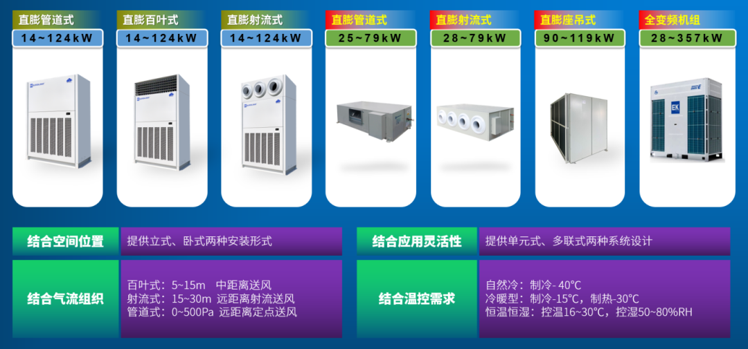 EK新一代綠色工廠工業多聯解決方案,具有立式、臥式兩種安裝形式,提供百葉式、射流式、管道式多樣化送風形式,結合應用靈活性提供單元式、多聯式兩種形式,產品包括自然冷型、冷暖型、恒溫恒濕型,涵蓋工業廠房溫控解決方案、工業變配電室解決方案、工業倉儲解決方案。