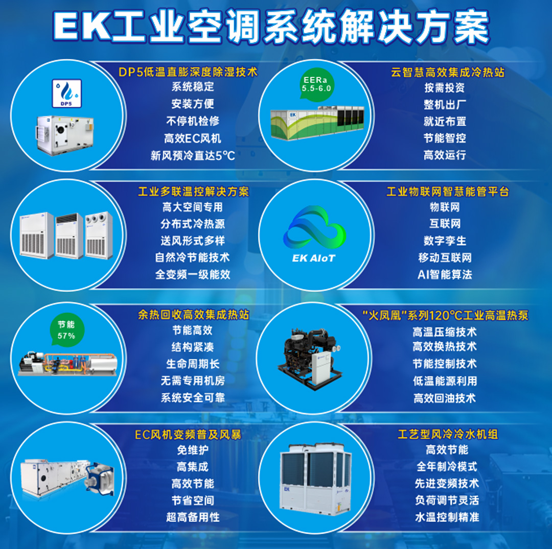 張夏指出,EK節能降碳路線可歸納為“AIoT、節能、減負、回用、替代、高效”六大關鍵詞。她進一步分享雲智慧高效集成冷熱站、工業高溫熱泵、變頻工藝型冷熱源家族、EK DP5低溫直膨深度除濕技術、工業多聯溫控解決方案,以及工業物聯網智慧能管平台等核心節能產品和係統方案,覆蓋工業環境控製、工藝用冷熱水、工業高溫熱泵、廠房/設備間降溫等工業應用場景,全力支持客戶節能增效和綠色轉型。