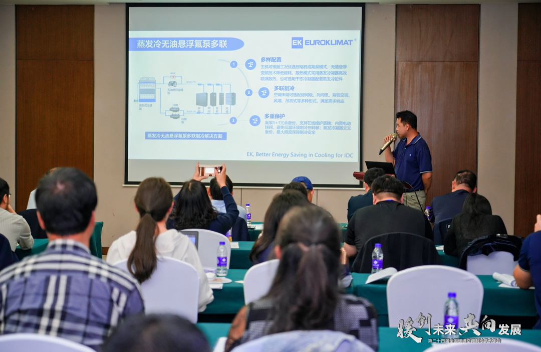 在演講中,古正中詳細介紹EK間接蒸發冷卻機組、無油懸浮多聯蒸發冷機組和一體式蒸發冷螺杆冷水機組等綠色低碳係統方案,為行業帶來EK空調在蒸發冷技術方麵的思路和解決方案。