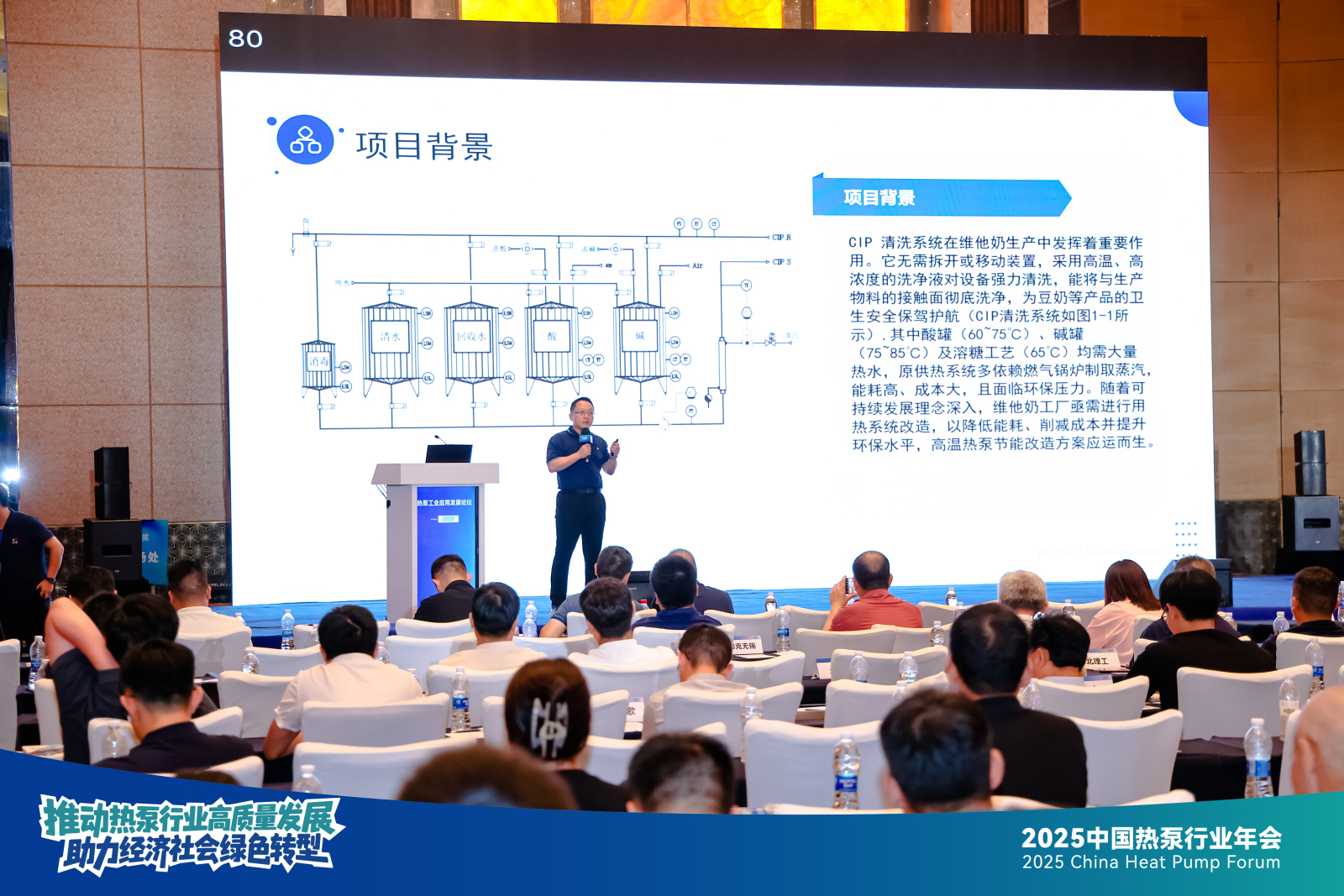 工業熱泵應用案例分享環節,EK工業冷熱源係統事業部產品經理 朱曉廣為大家展開介紹維他奶高溫熱泵節能改造項目。