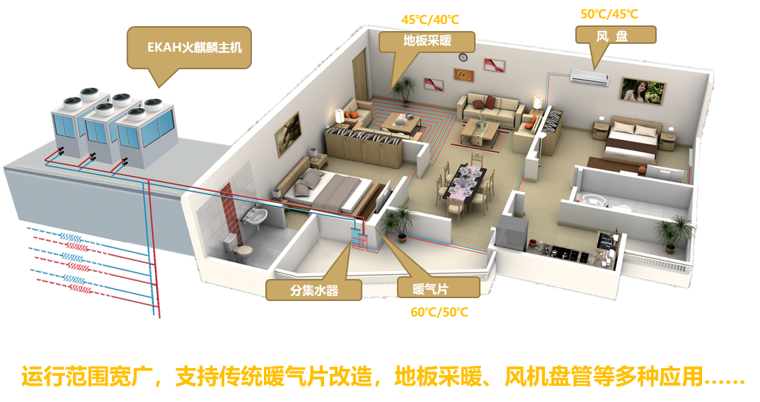 EK超低溫空氣源熱泵機組憑借超低溫環境穩定製熱、寬域運行範圍、智能運維等卓越性能與廣泛的應用場景,在北方煤改電采暖市場中脫穎而出,為工業、商業、民用等多領域提供低碳、舒適的溫暖體驗。