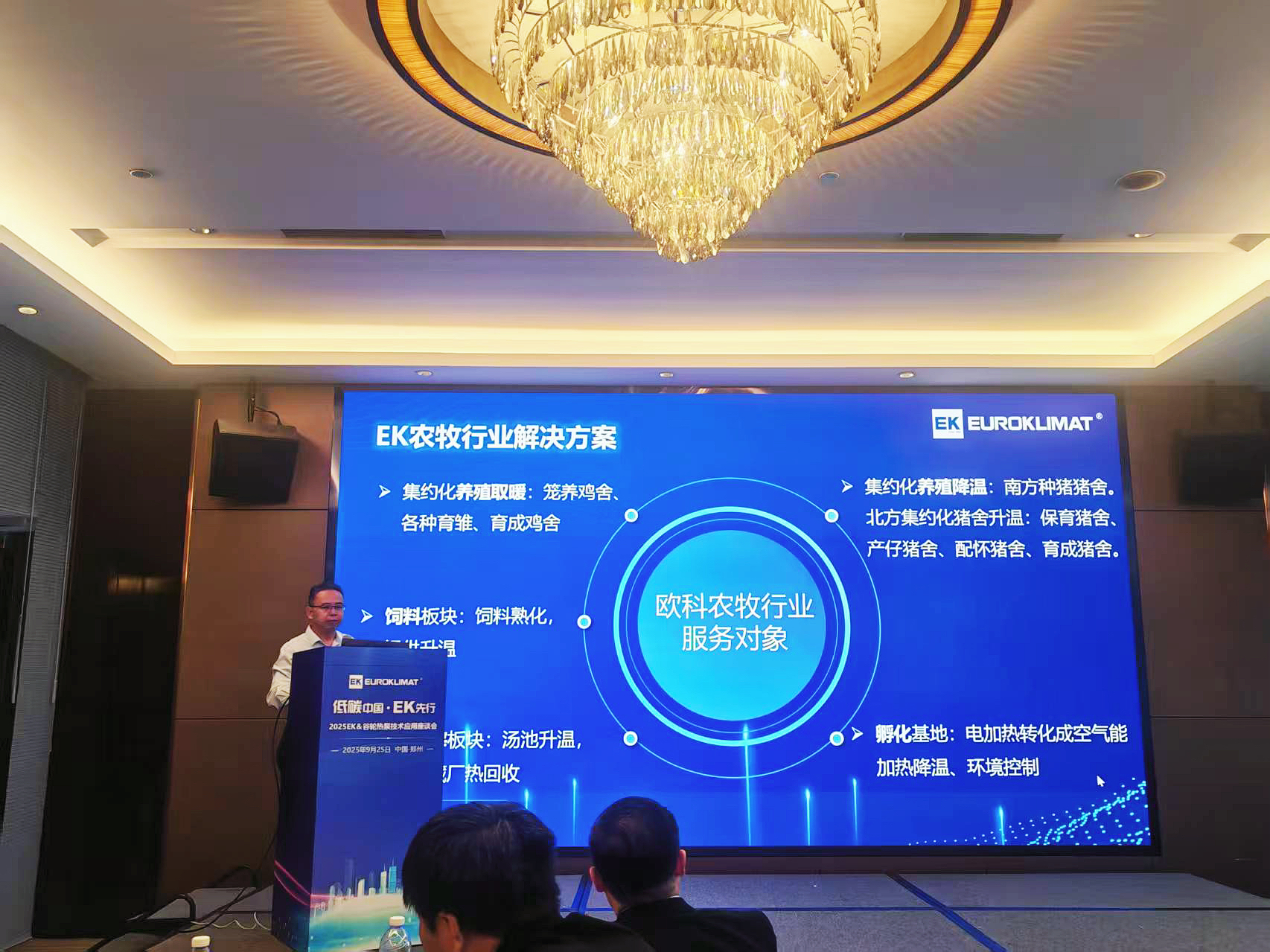 會議尾聲,鄒兵進一步分享EK工業高溫熱泵在屠宰行業應用。結合屠宰工廠的多樣化用熱需求,EK空調可提供空氣源、複疊式高溫熱泵及水源高溫熱泵機組多種組合方案,為客戶提供低碳、高效的熱源選擇。