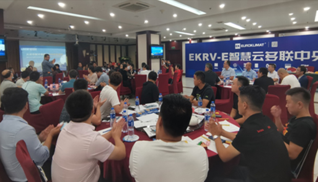 EK多聯機銷售總監張旭東,天津多聯機總經理陳鋒、產品工程師韓曉彬代表EK出席此次會議。會上進行了EK品牌曆程、核心技術、全係列產品的分享,並重點介紹了EK智慧雲多聯機-30℃穩定製熱技術、差異化賣點、雲服務等。