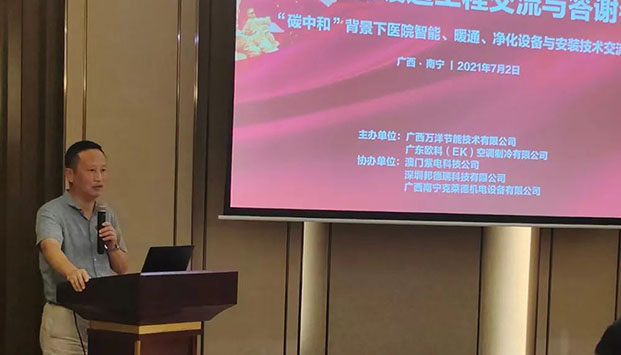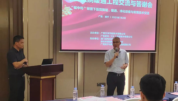 7月2日,由EK空調和EK核心經銷商廣西萬洋節能技術有限公司主辦,澳門紫電科技公司、深圳邦德瑞科技有限公司、廣西南寧克萊德機電設備有限公司協辦的綜合醫院暖通工程交流與答謝會在南寧荔園維景國際大酒店隆重舉辦。EK柳州辦事處經理周文光、EK南寧辦事處經理王勝龍、華藍設計(集團)有限公司建築機電與環保設計所所長李申、廣西製冷協會會長黃孝軍以及醫院暖通設計專家和醫院工程總承包單位朋友齊聚一堂,共襄盛會。