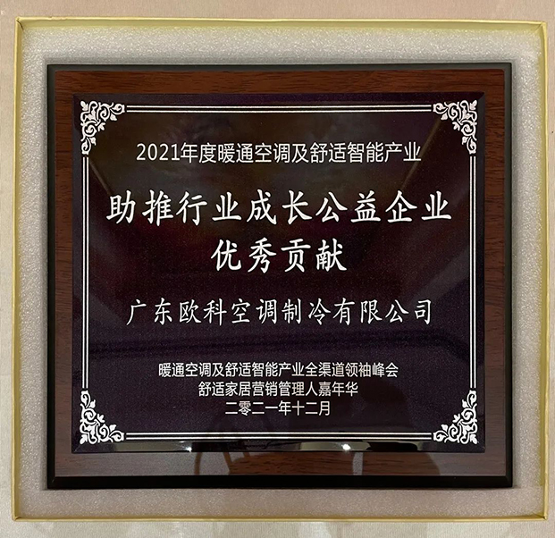 在2021年度暖通空調及舒適智能產業品牌企業榮譽榜單發布環節中,廣東歐科空調製冷有限公司榮獲“助推行業成長公益企業優秀貢獻”稱號。