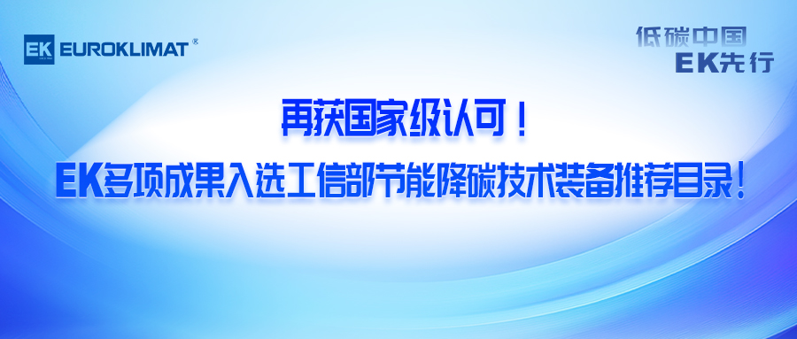 再獲國家級認可!EK多項成果入選工信部節能降碳技術裝備推薦目錄!2025.11.17EK工業空調憑借在節能降碳領域的係統化創新能力,旗下氟泵自然冷技術、三管製冷凝熱回收技術、一體化高效低露點轉輪除濕係統三大節能技術,以及EKAH500CHS1V與EKAH1700CHS1V低環境溫度空氣源變頻熱泵機組成功入選,獲得國家層麵權威認可。