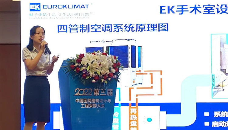 大會現場,EK空調水係統產品經理呂芳玉以《EK熱回收係統與您攜手共建環境友好型醫院》為主題發表演講。呂芳玉以廈門大學附屬翔安醫院為例,和大家詳細介紹了EK節能空調設備在不同醫院場景的應用。