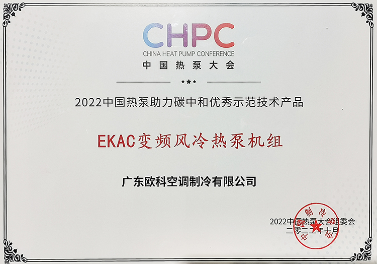 同時,EK旗下EKAC變頻風冷熱泵機組憑借高能效、節能環保等特點,成功斬獲“2022中國熱泵助力碳中和優秀示範技術產品”獎。