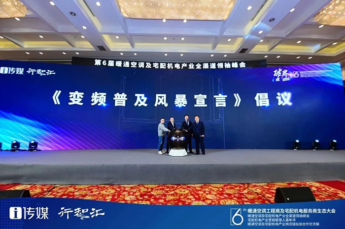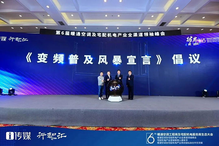 基於“雙碳”政策目標、暖通空調行業“節能減排”重任、變頻技術的巨大市場空間等社會現狀,EK依托自身在“變頻”技術上的深厚積累,以及對“雙碳”政策的積極響應,決定向全行業發起變頻模塊普及倡議,呼籲並引導行業邁入模塊機全變頻時代。EK空調市場營銷總監王健作為代表,上台宣讀了EK《變頻普及風暴倡議》。