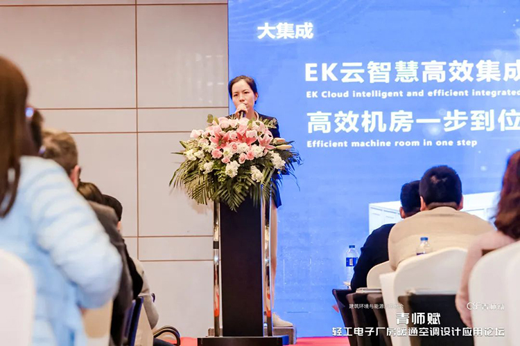 在本次論壇上,行業大咖、企qi業ye代dai表biao與yu青qing年nian設she計ji師shi們men展zhan開kai了le深shen入ru交jiao流liu,精jing準zhun發fa力li破po解jie輕qing工gong電dian子zi領ling域yu建jian築zhu暖nuan通tong空kong調tiao設she計ji痛tong點dian。參can會hui專zhuan家jia和he企qi業ye代dai表biao們men從cong不bu同tong角jiao度du分fen享xiang了le暖nuan通tong空kong調tiao產chan品pin在zai輕qing工gong業ye領ling域yu的de應ying用yong、解決方案和經驗。EK空調產品經理呂芳玉帶來了以《EK雲智慧高效集成冷站在工業領域的應用》為主題的分享。