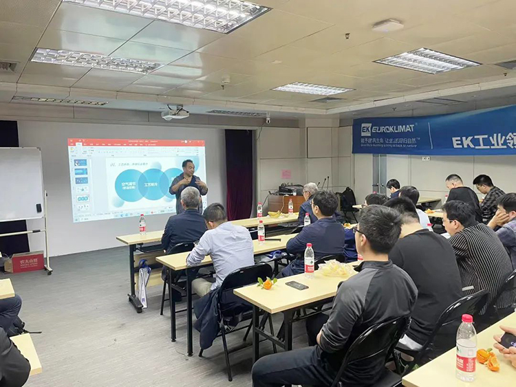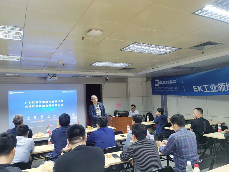 交流會上,EK空調IECD事業部主管楊衛剛和現場嘉賓介紹了EK變頻直膨式空氣處理機組、變頻冷凝熱回收直膨機組、高大空間射流直膨空調機組等直膨工業產品的特點,以及它們在工業場景的應用。