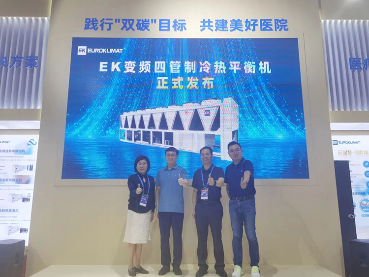 CHCC2023開展首日,EK空調舉行了變頻四管製冷熱平衡機新品發布儀式。中國中元國際工程有限公司總工程師黃中、華信醫療建築設計研究院總工程師嶽慧峰、EK空調華西區區總胡燕玲、EK空調中國區市場營銷總監兼IECD事業部總監王健等行業專家和企業領導共同見證了該機組的正式發布。