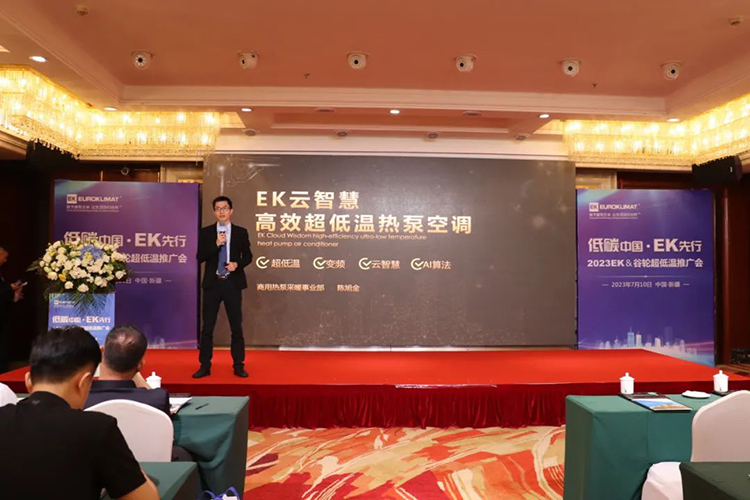 EK空調產品經理陳旭金則以《EK雲智慧高效超低溫熱泵空調》為主題,和現場嘉賓介紹了普通風冷熱泵和超低溫空氣源熱泵的區別,EK超低溫熱泵的發展曆史、產品陣容、係統優勢以及在嚴寒地區各行業的應用案例。