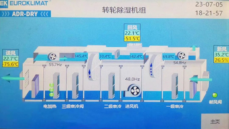 該機組適用於低露點的工藝要求,室內露點最低可達-80℃,節能率達40%以上,可應用於電芯烘烤、注液、封口等電池生產車間的多個工藝環節。