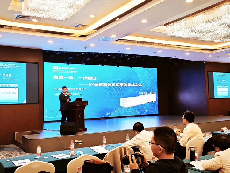 年會現場,EK空調大型冷水機事業部徐楓林以《高效一體、一步到位——EK雲智慧分布式高效集成冷站》為題發表演講,和現場嘉賓重點介紹了EK高效機房係統核心產品——雲智慧分布式高效集成冷站的組成、特點、優勢、應用場景和項目案例。
