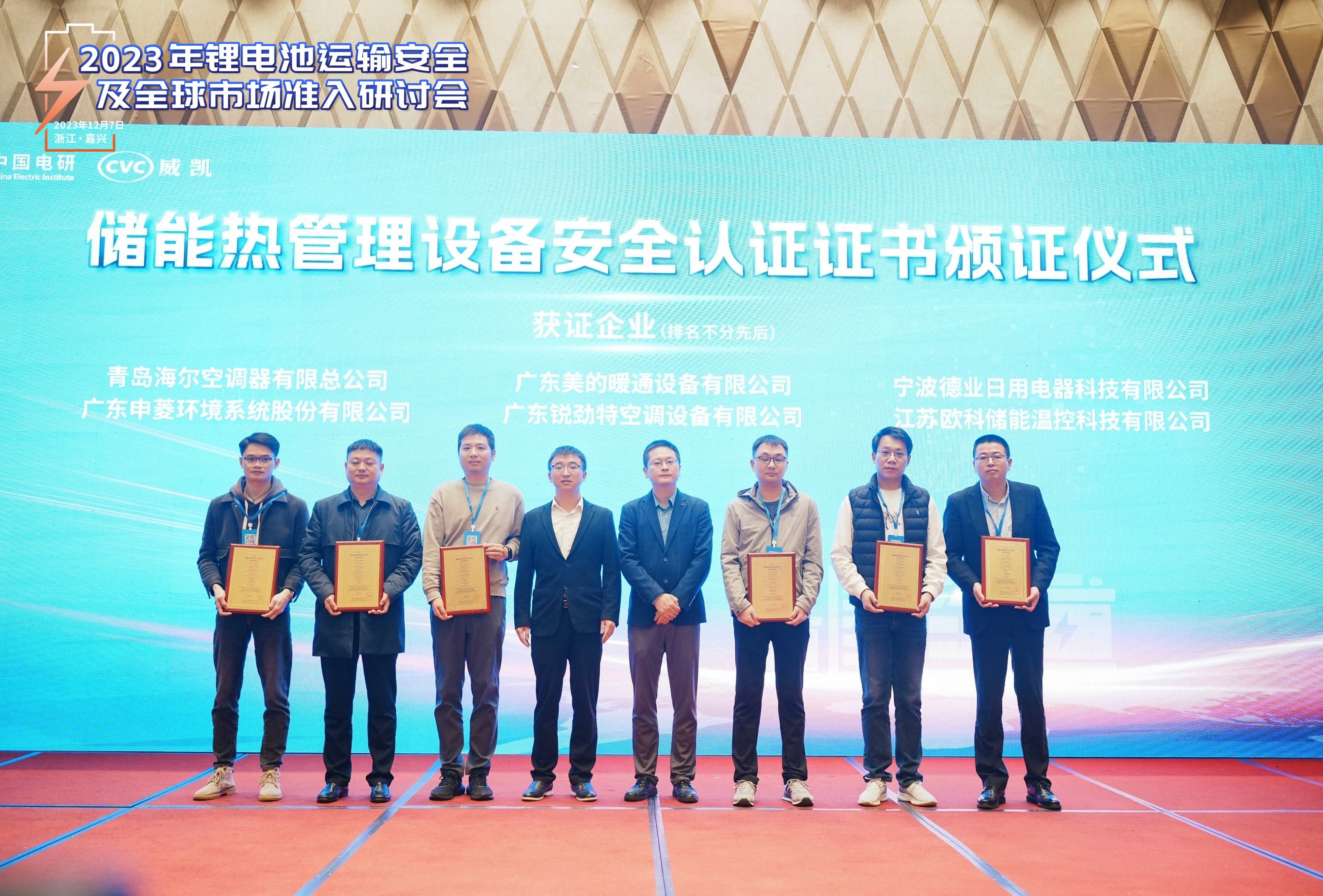 近日,由中國電研CVC威凱主辦的“2023年鋰電池運輸安全及全球市場準入研討會暨首批儲能係統熱安全認證——儲能熱管理機組證書頒證儀式”在浙江嘉興成功舉辦,引起了行業內廣泛關注。大會上,EK榮獲首批儲能係統熱安全認證——儲能熱管理機組證書,成為會議焦點之一。