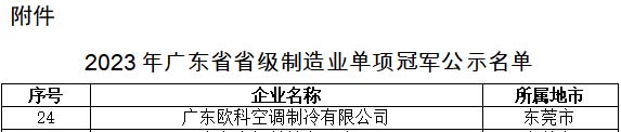 近日,廣東省工業和信息化廳公示了《2023年廣東省省級製造業單項冠軍名單》,廣東歐科空調製冷有限公司(簡稱“EK空調”)以其卓越的自主創新能力和生產製造能力,成功獲評“2023年廣東省省級製造業單項冠軍”。