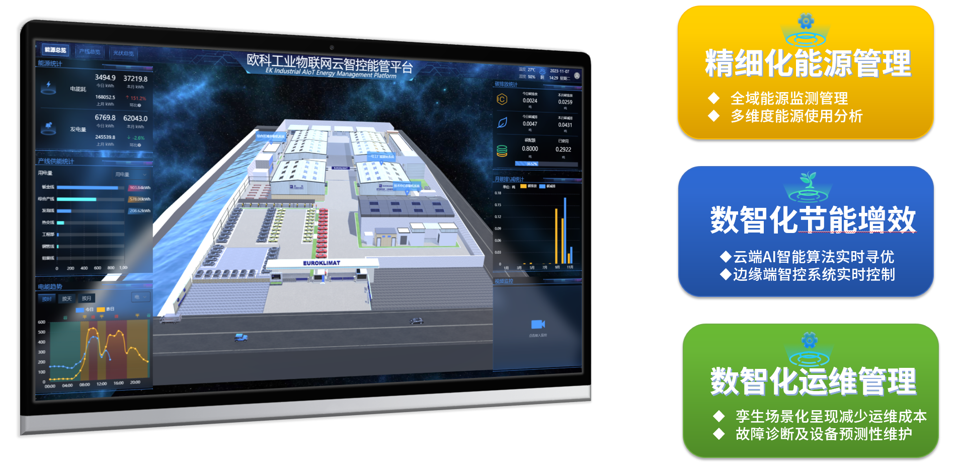 EK-AIoT智慧雲係統是EK工業空調自主研發的工業物聯網智慧能管平台,集AI計算、數字孿生、互聯網、物聯網、移動互聯網於一體,與中央空調、鋰電行業轉輪除濕等工業場景相結合,圍繞數智化節能增效和數智化運維管理這兩點核心價值提供服務,提供了工業場景雲端智能控製、遠程運維、線上協同、節能增效等端到端一體式解決方案。
