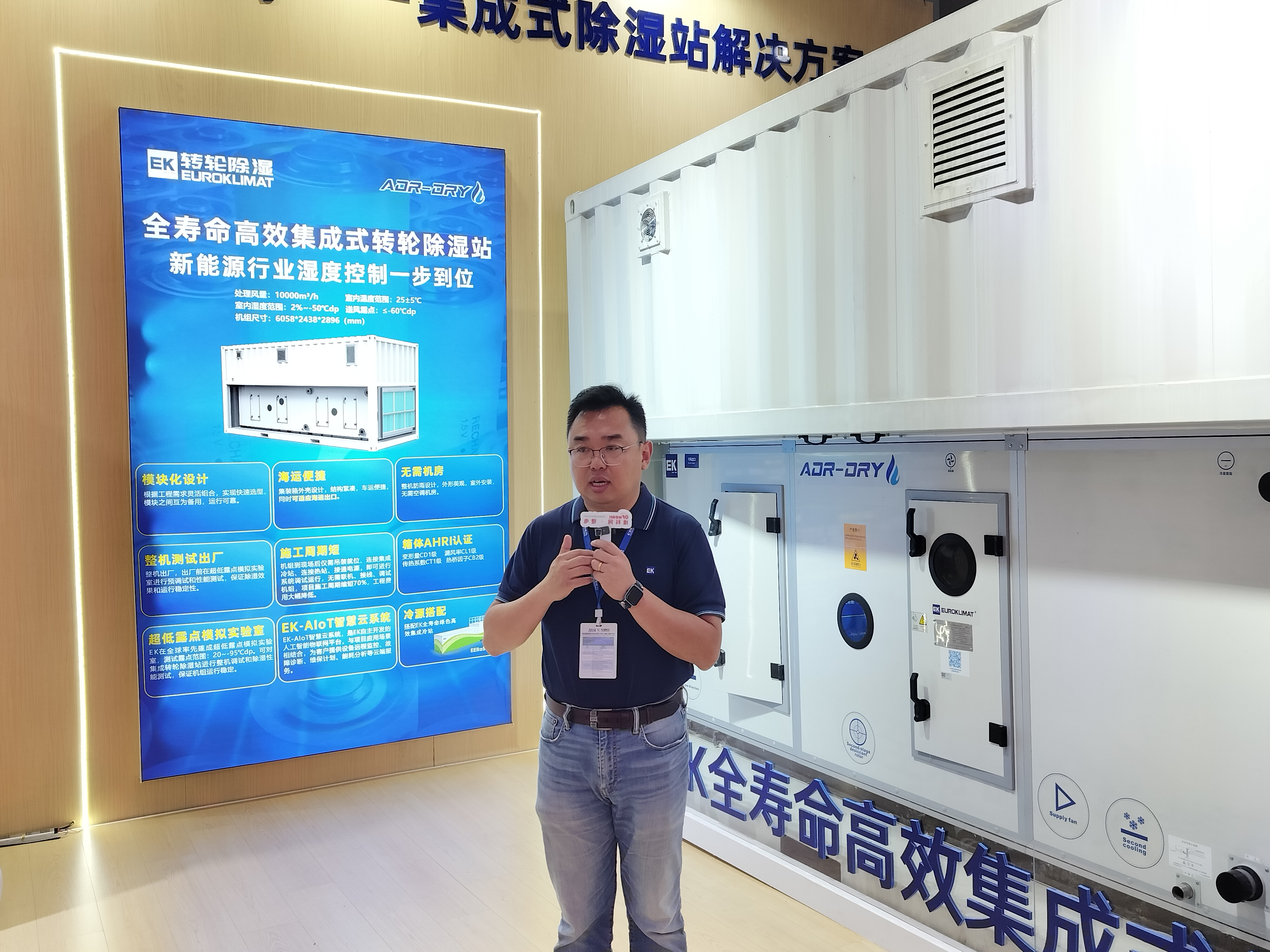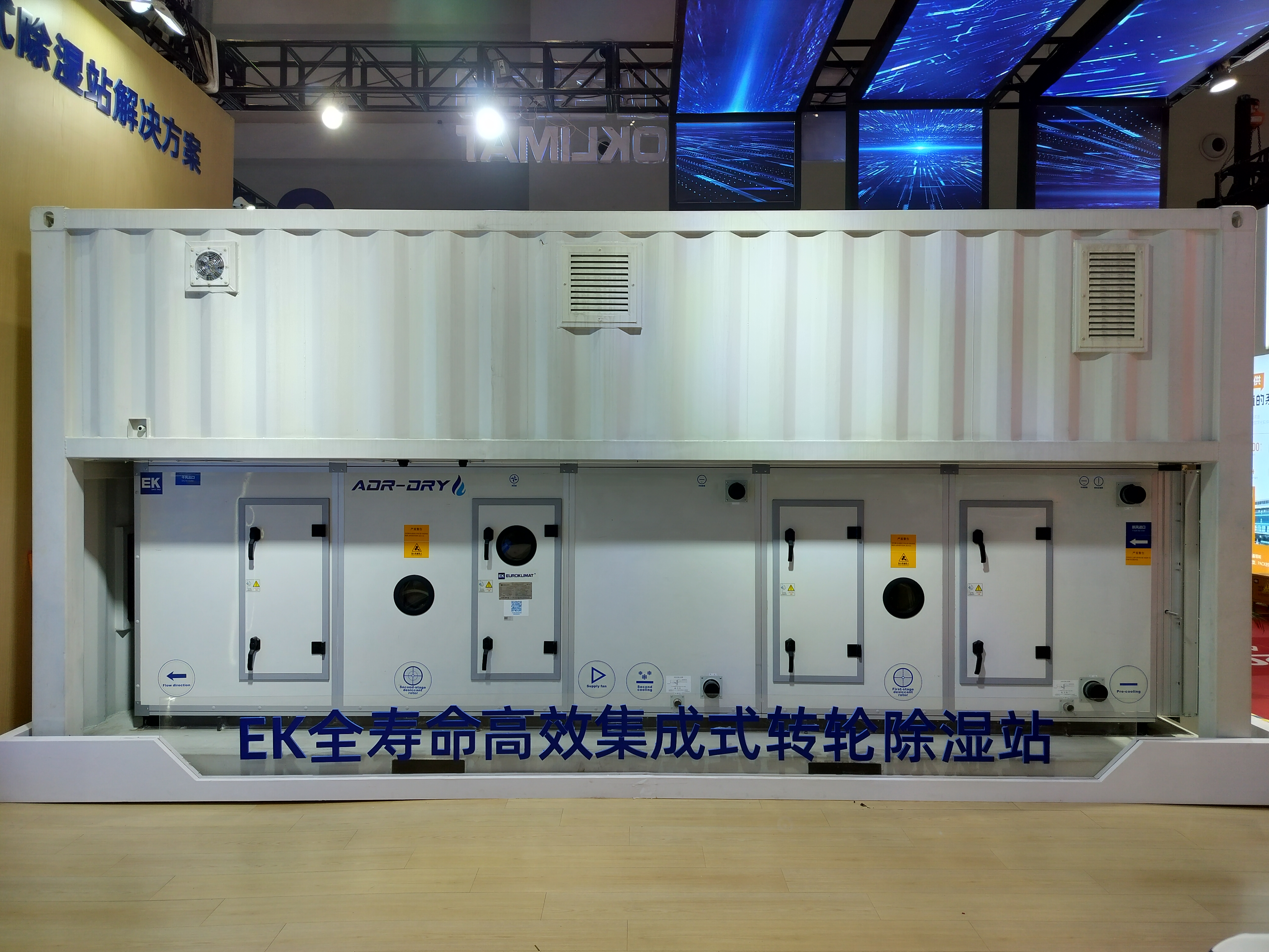 在這一背景下,EK工業空調展出了助力鋰電產業鏈企業出海的核心產品——全壽命高效集成式轉輪除濕站。該除濕站是基於LCC全壽命周期成本、產品全集成、嵌入產線、整機出廠、標準集裝箱運輸、現場“0”施工、雲端控製、全球化等理念設計的,機組通過美國AHRI認證和CE認證,解決了行業內除濕係統交付工程量大、運行能耗高的難題,實現新能源行業濕度控製的一步到位,為電芯企業出海之路提供了可靠的技術支撐。