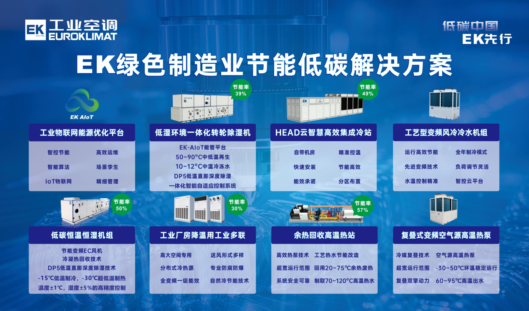 對此,EK工業空調以“綠色、低碳、智能”為關鍵詞,分別提供多管製冷熱平衡機、分布式高效集成冷站、溫濕分控新風調濕機、TITAN工業淨化組空、一體化高效轉輪除濕機、EK-AIoT工業用戶雲平台等解決方案,破解零碳難題,助力工業企業從耗能大戶升級為減碳標杆。