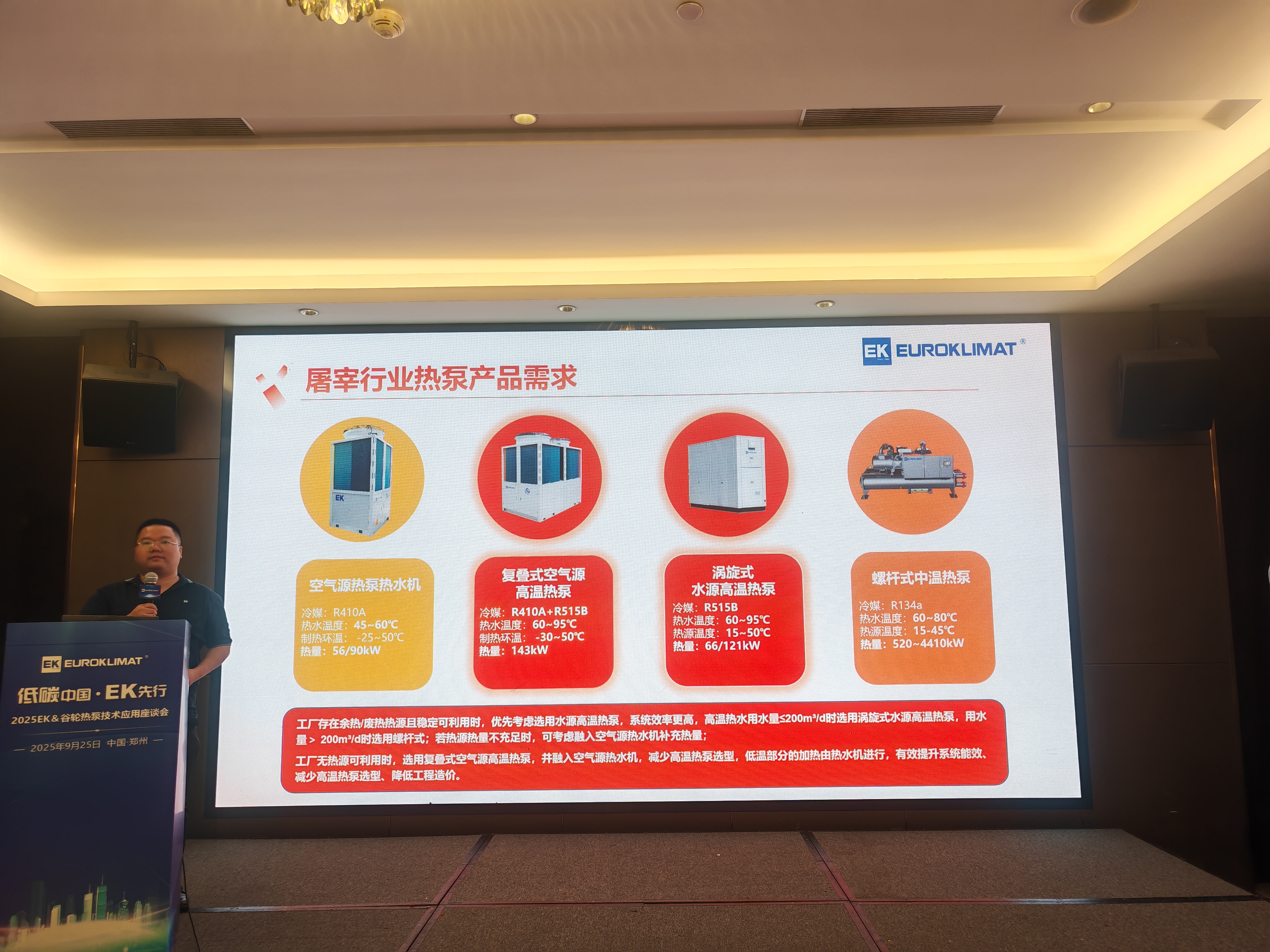 會議尾聲,鄒兵進一步分享EK工業高溫熱泵在屠宰行業應用。結合屠宰工廠的多樣化用熱需求,EK空調可提供空氣源、複疊式高溫熱泵及水源高溫熱泵機組多種組合方案,為客戶提供低碳、高效的熱源選擇。