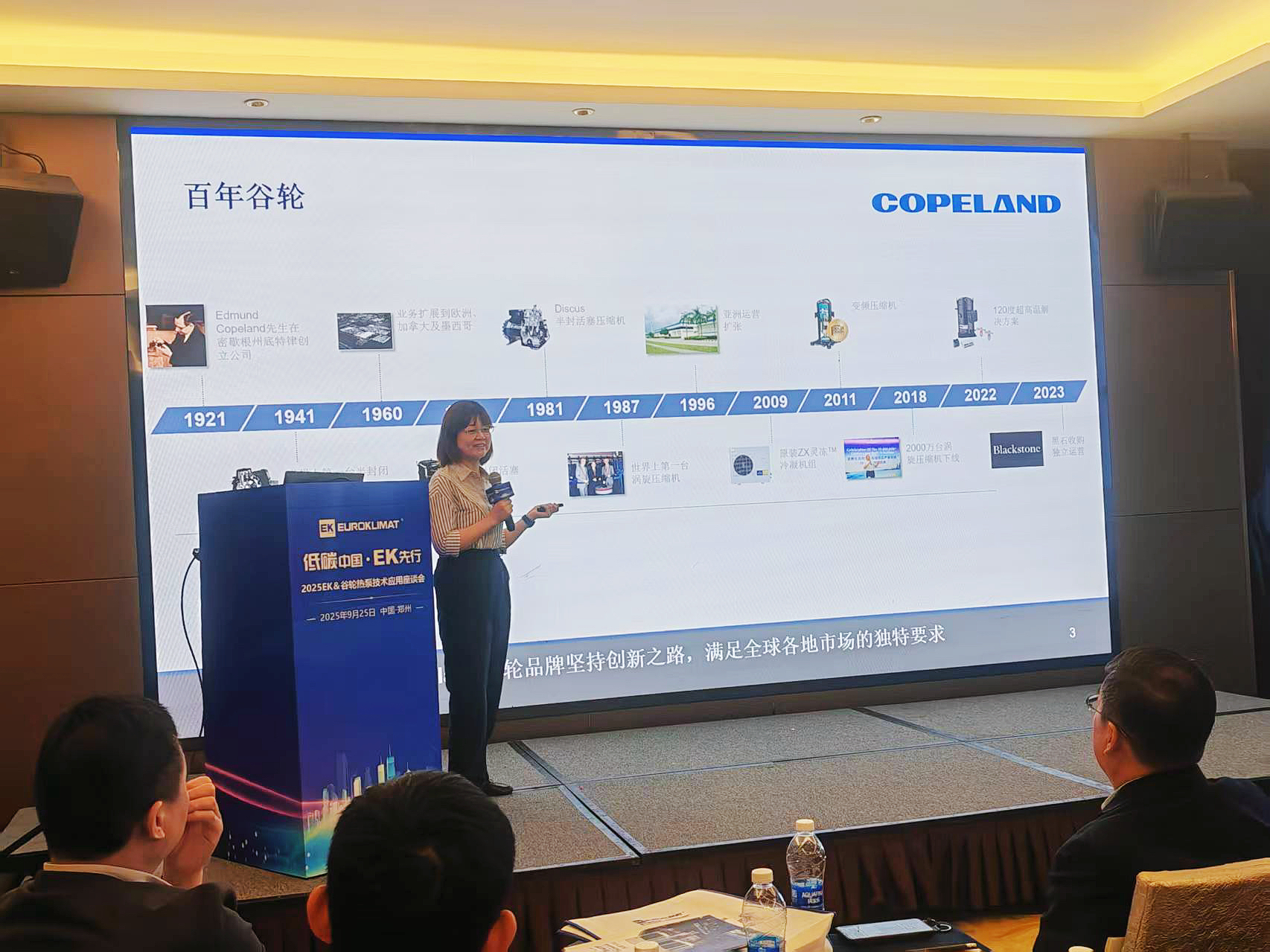 EK國際戰略合作夥伴——穀輪的市場部經理康靜,也在會上帶來穀輪低溫產品技術介紹。作為空調係統的“心髒”,穀輪壓縮機的技術突破,進一步提升EK熱泵機組在極寒條件下的性能與穩定性。
