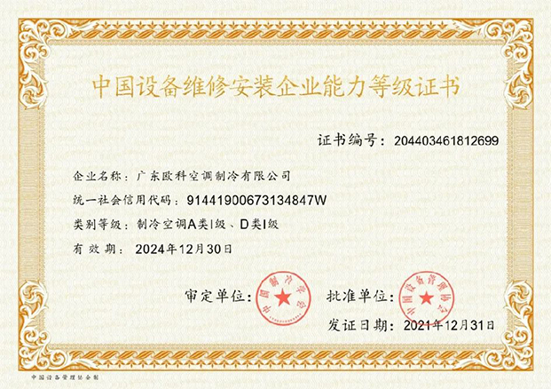“中國設備維修安裝企業能力等級證書(製冷空調A類Ⅰ級、D類Ⅰ級)”則由中國製冷學會和中國設備管理協會認證頒發,皆是行業認可的權威認證。